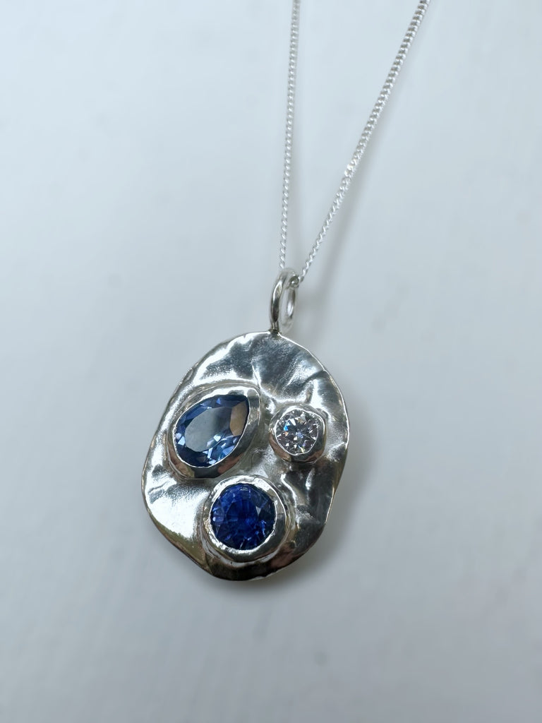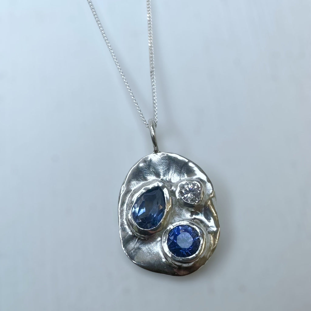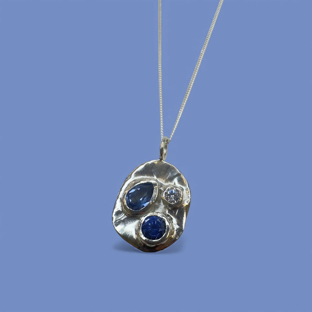 One of a kind Blue Lab Sapphire and Diamond Confetti pendant in sterling silver.  Part of our latest colourful Christmas collection. Complete with our signature Molten organic surface texture and organic rub-over setting.  The perfect treat to yourself, or gift for someone special.