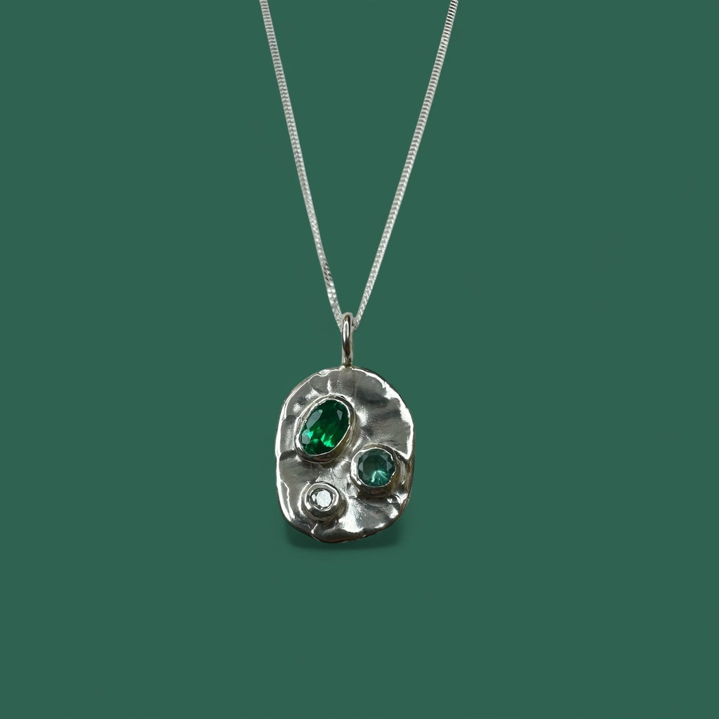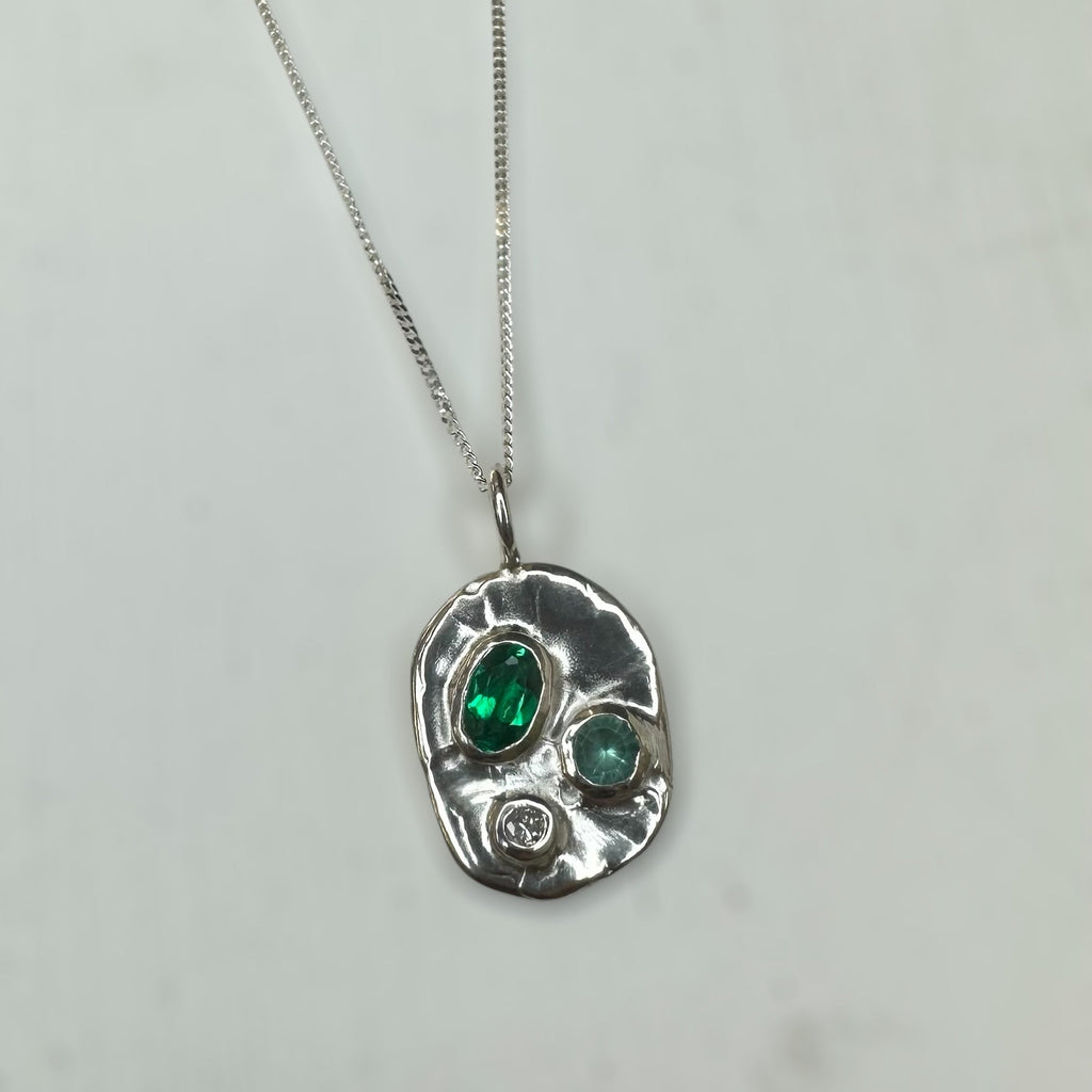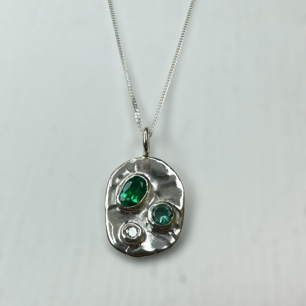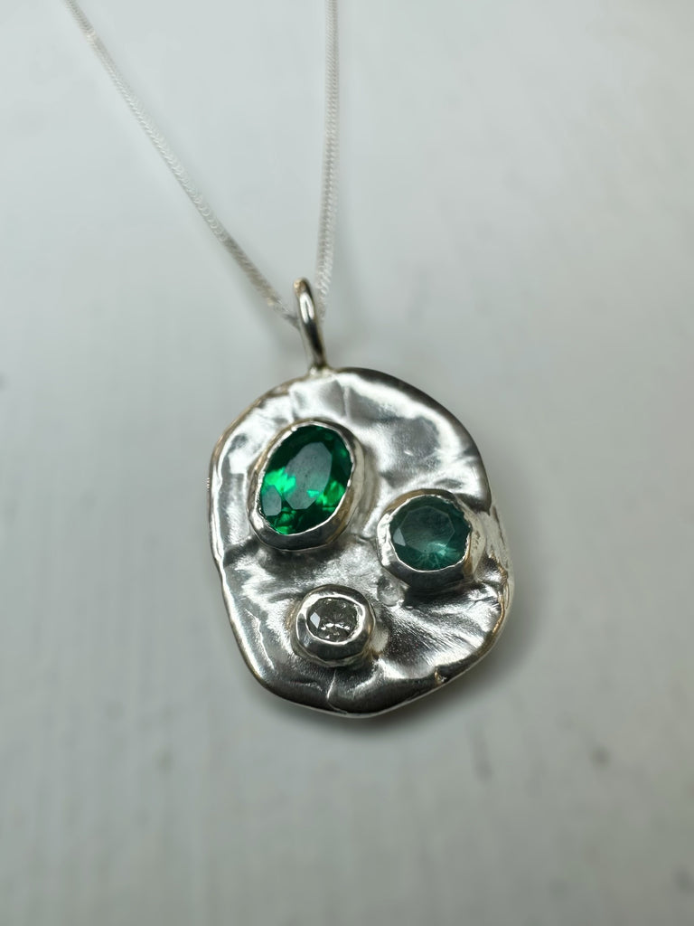 One of a kind Green Hydrothermal Emerald, Lab Sapphire and Diamond Confetti pendant in sterling silver. Part of our latest colourful Christmas collection. Complete with our signature Molten organic surface texture and organic rub-over setting. The perfect treat to yourself, or gift for someone special.