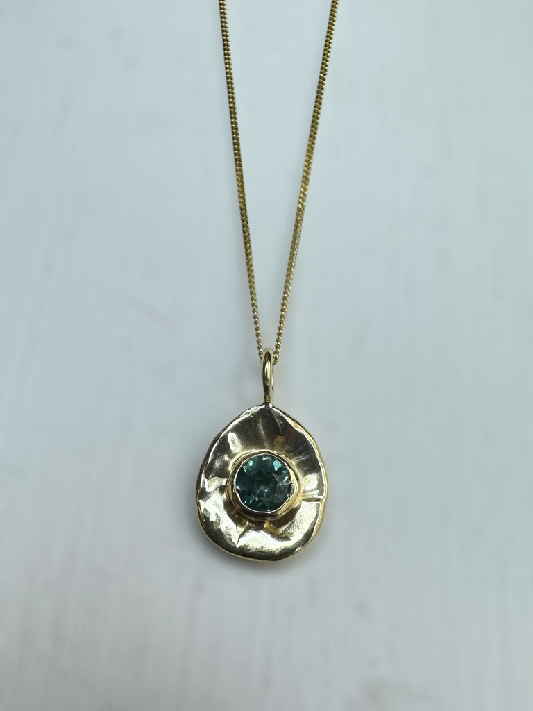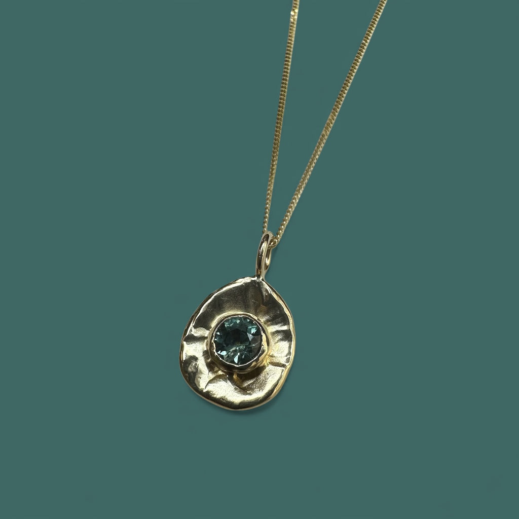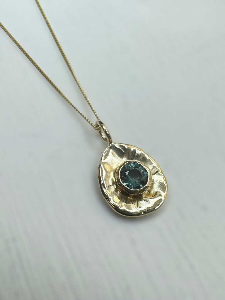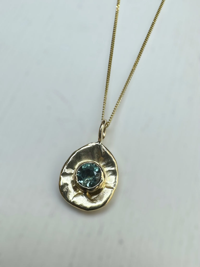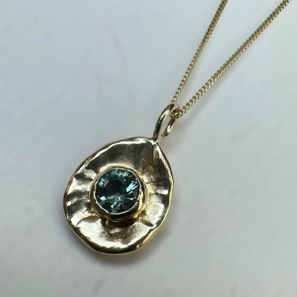 One of a kind Natural Montana Teal Blue Sapphire Confetti pendant in 9ct yellow gold.  Part of our latest colourful Christmas collection. Complete with our signature Molten organic surface texture and organic rub-over setting.  The perfect treat to yourself, or gift for someone special.