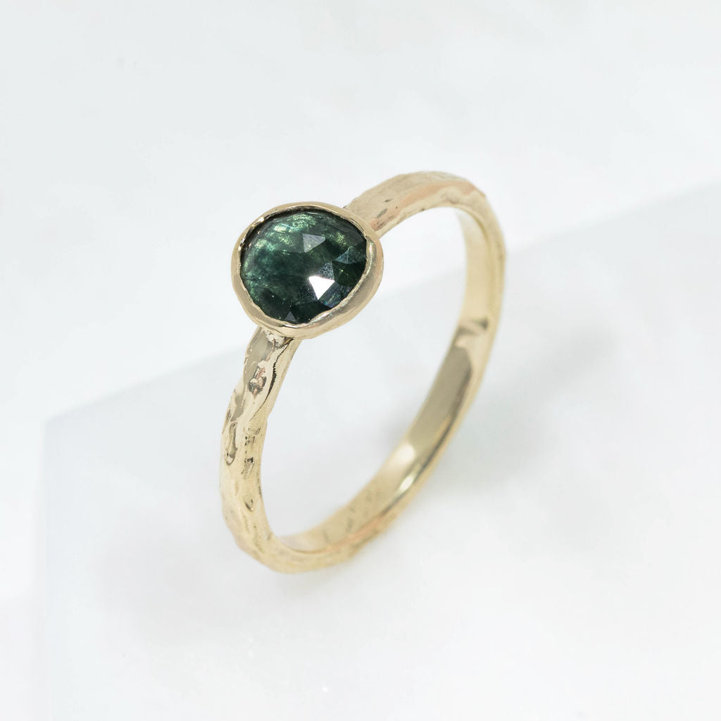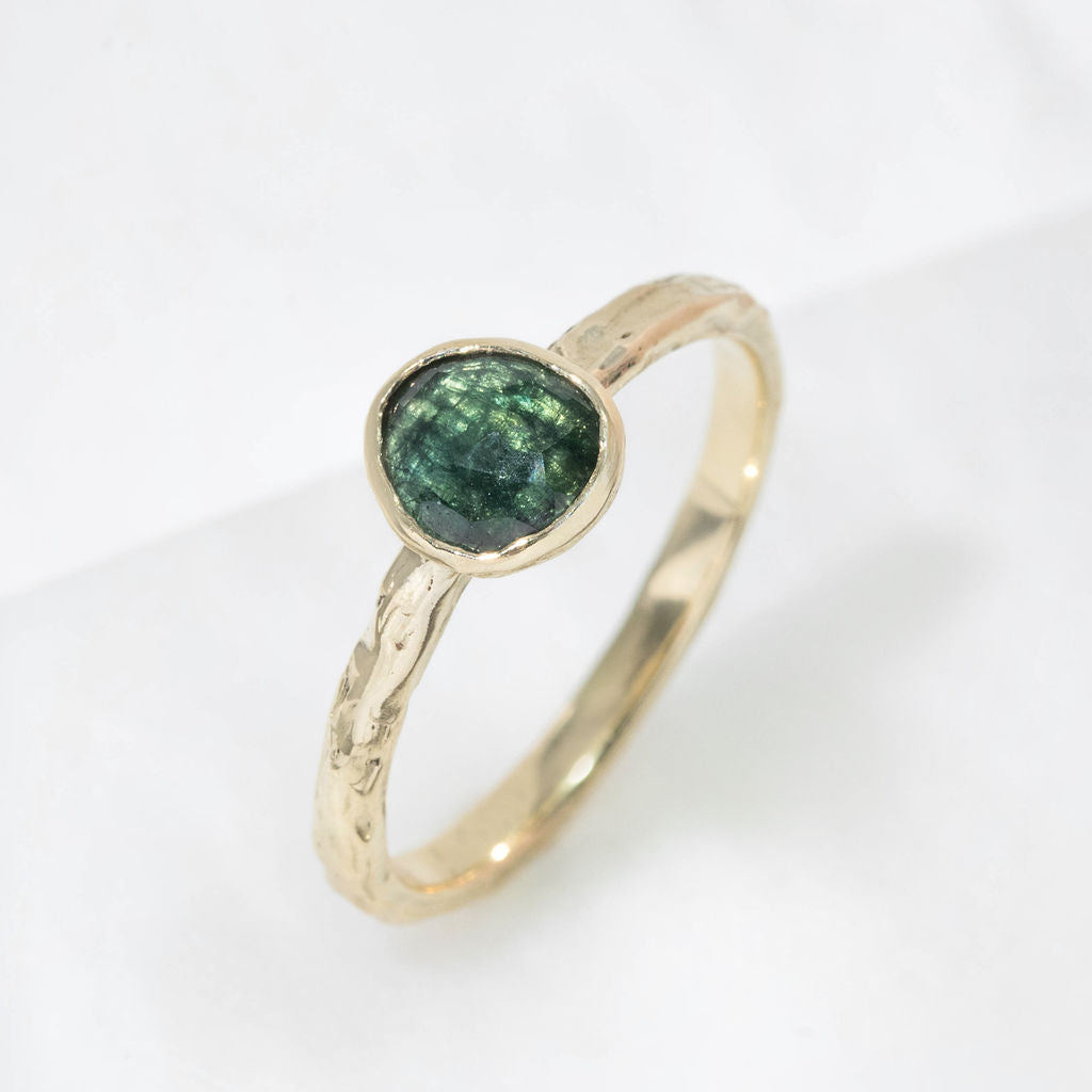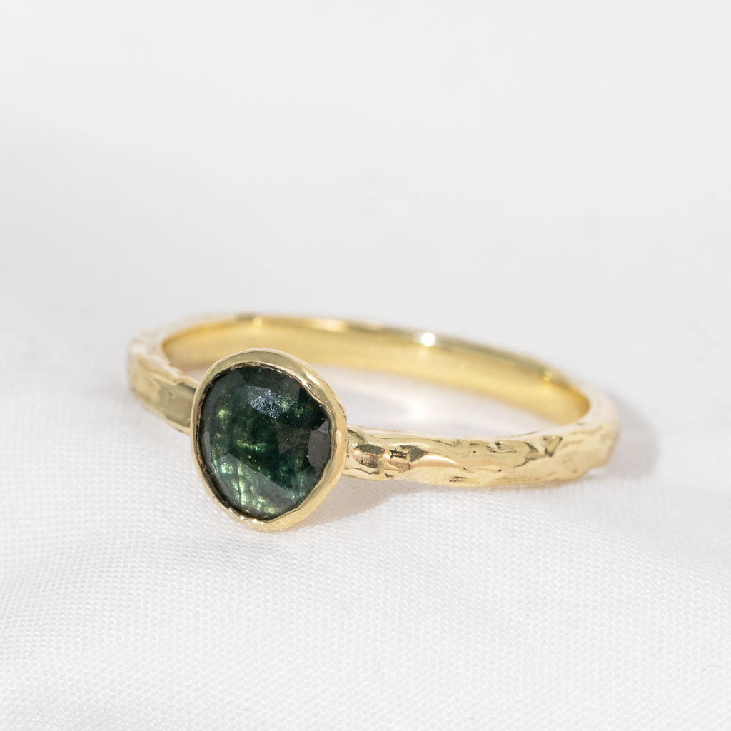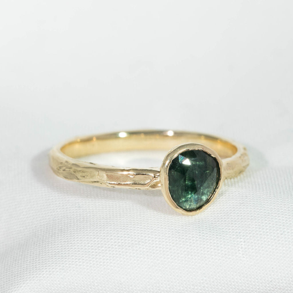 One of a kind 9ct yellow gold and teal sapphire ring. A stunning teal green/blue toned sapphire takes centre stage, with our signature Molten organic surface texture and minimal rub-over setting. The perfect treat to yourself, gift for a special occasion or even an alternative choice for an engagement ring.