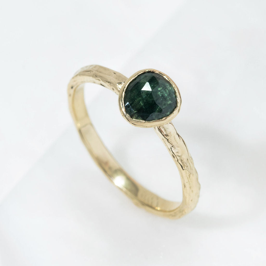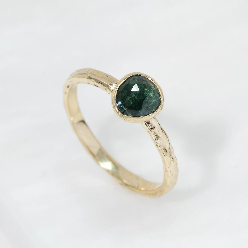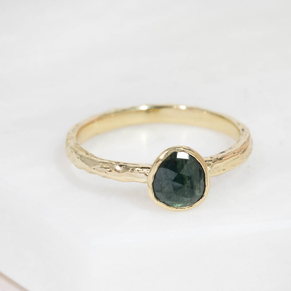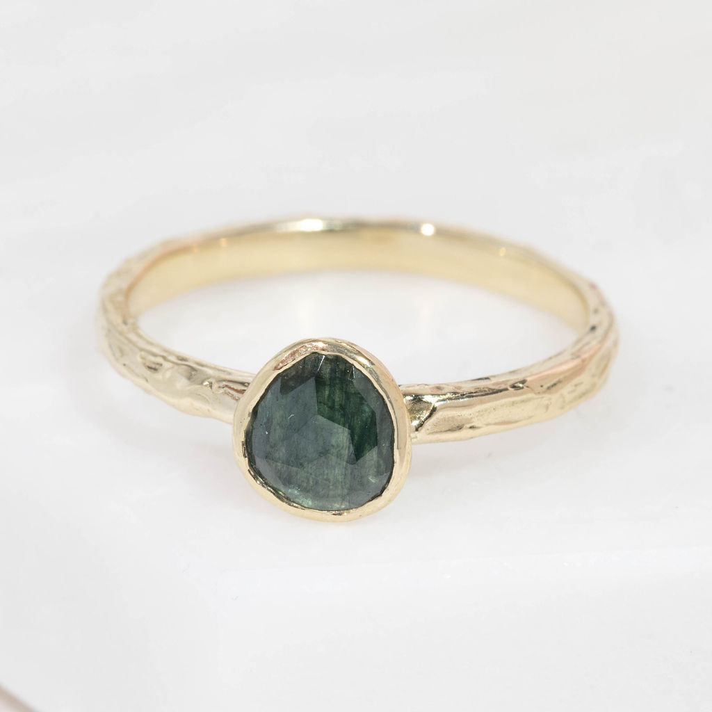 One of a kind 9ct yellow gold and teal sapphire ring. A stunning teal green/blue toned sapphire takes centre stage, with our signature Molten organic surface texture and minimal rub-over setting. The perfect treat to yourself, gift for a special occasion or even an alternative choice for an engagement ring.