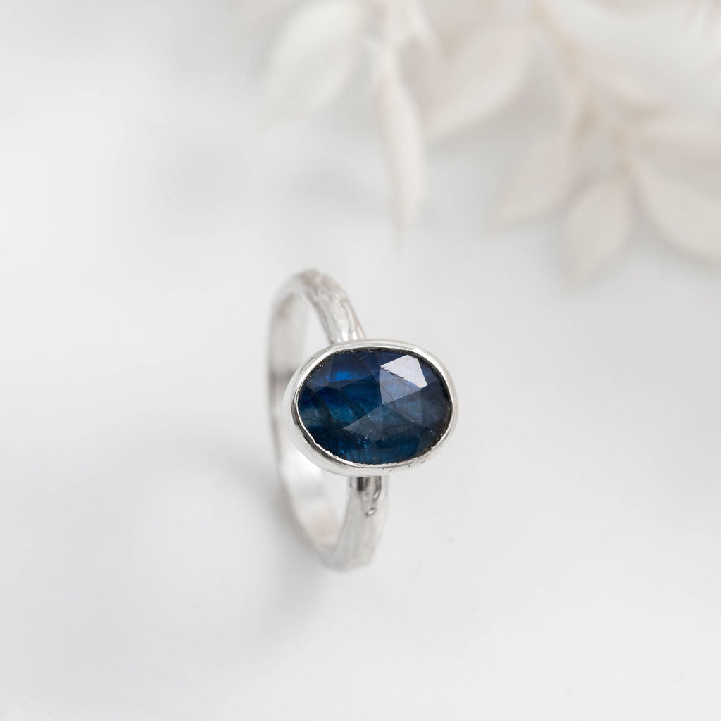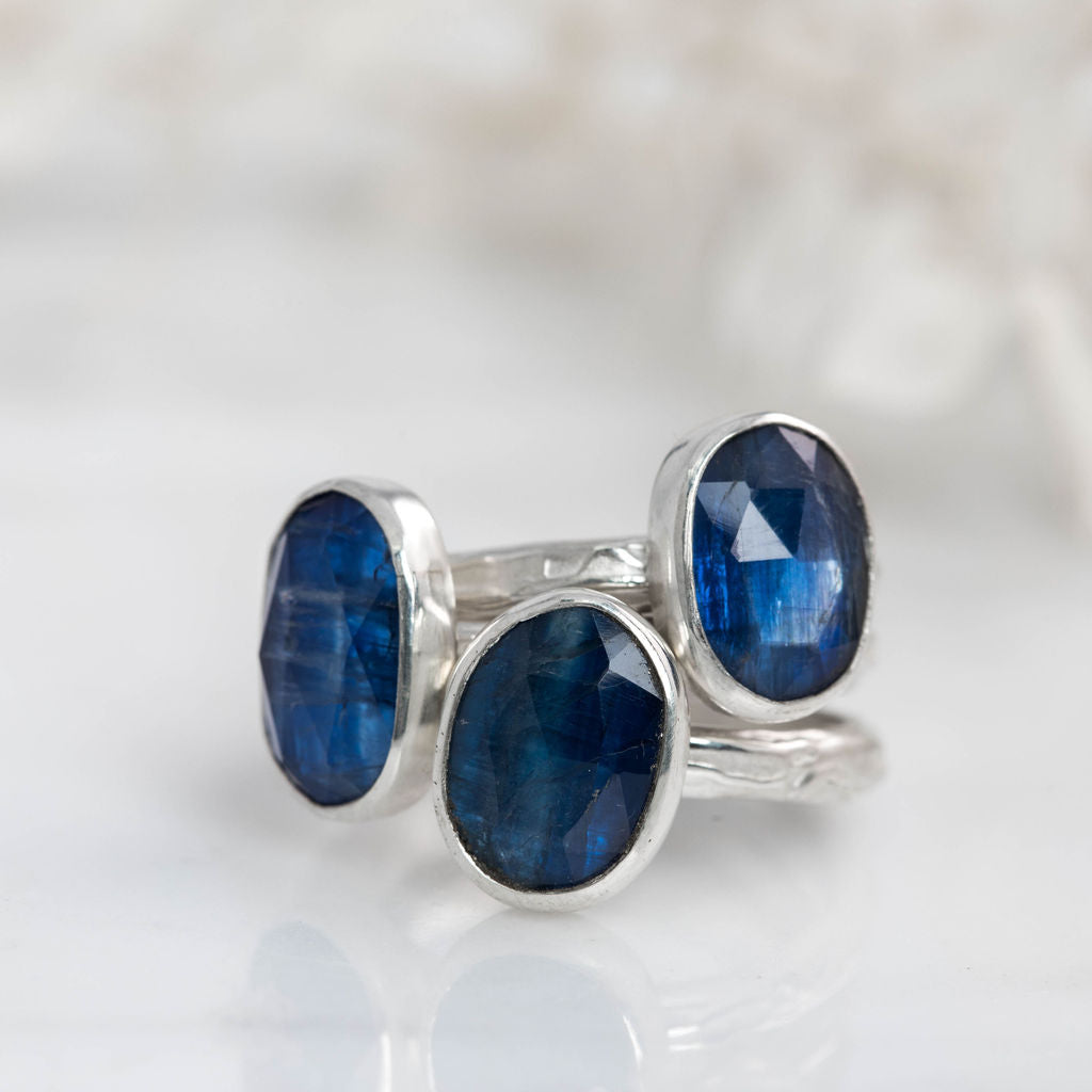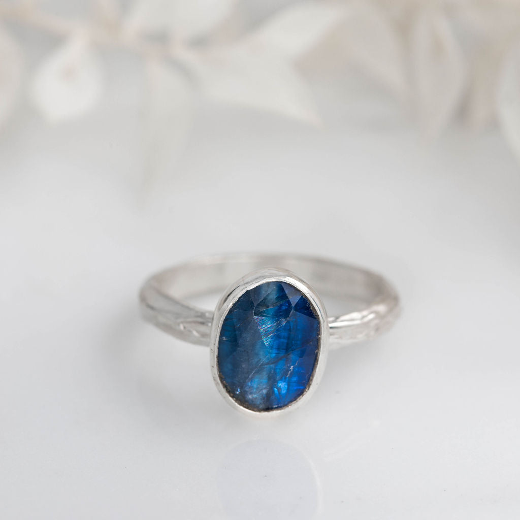 One of a kind Blue Kyanite and sterling silver ring. Blue Kyanite is connected to the throat chakra and helps the wearer cut through their fears and blockages to communicate their truest self. A gorgeous flash and bright blue tone, with molten surface texture on the band.