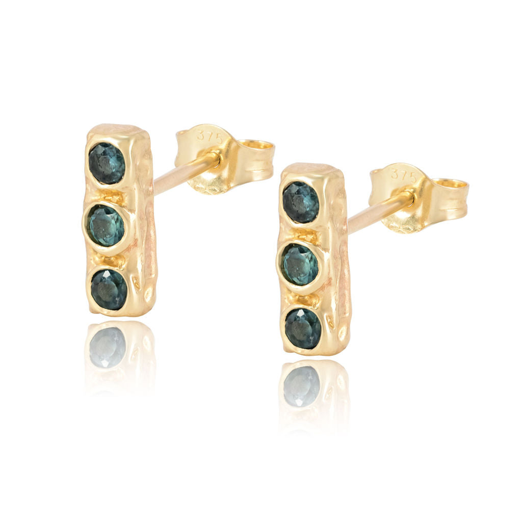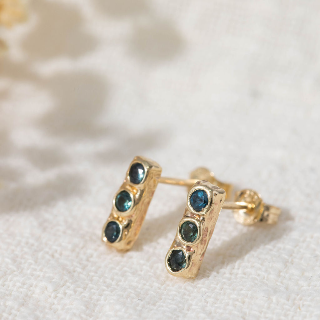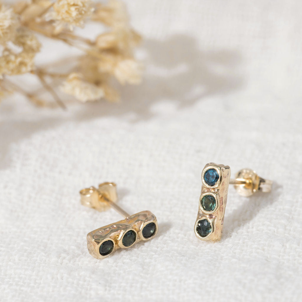 9ct Gold and Teal sapphire bar stud earrings as part of our one of a kind 'Azure' collection. Sapphires in an array of teal greens and blues, nestled into soft organic texture and form. Reminiscent of warm golden afternoons, these studs are the perfect every day little luxury.